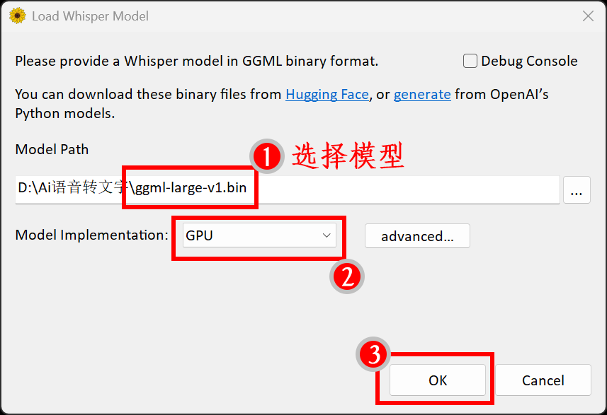 接着运行WhisperDesktop.exe,选择模型ggml-large-v1.bin后点击OK